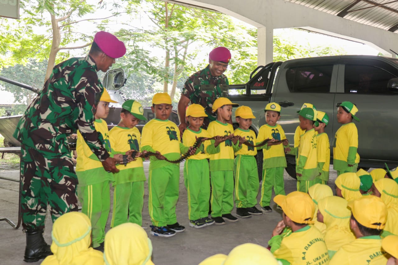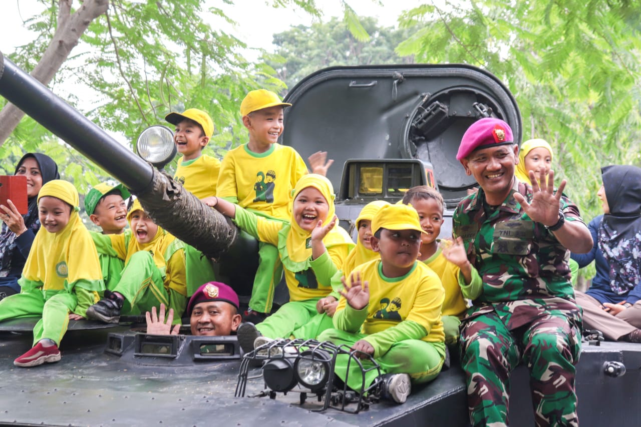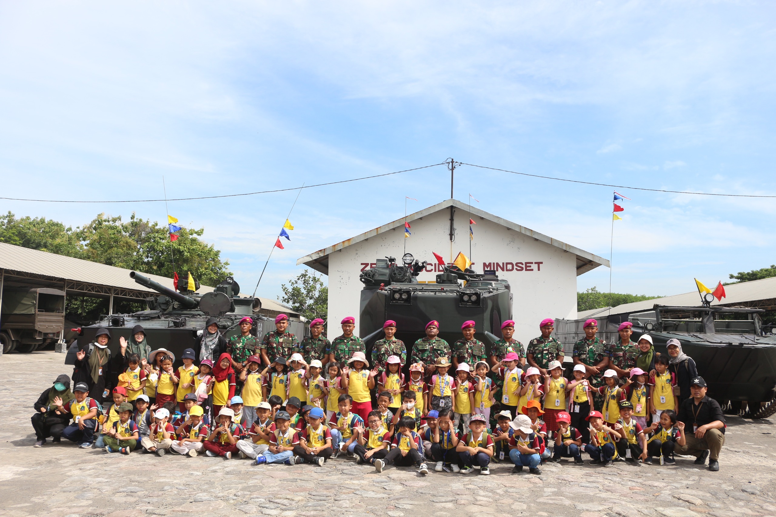 Dispen Kormar TNI AL (Surabaya). 60 anak TK-B SAIM bersama Ustadz dan Ustadzah melakukan kunjungan belajar ke Markas Komando Resimen Kavaleri 2 Marinir (Mako Menkav 2 MAR) di Kesatrian Marinir Soepraptono, Semarung, Ujung, Surabaya Timur, Rabu (12/2/2025). Kunjungan ini bertujuan untuk mengenalkan anak-anak pada kendaraan tempur serta menumbuhkan jiwa nasionalisme sejak dini.