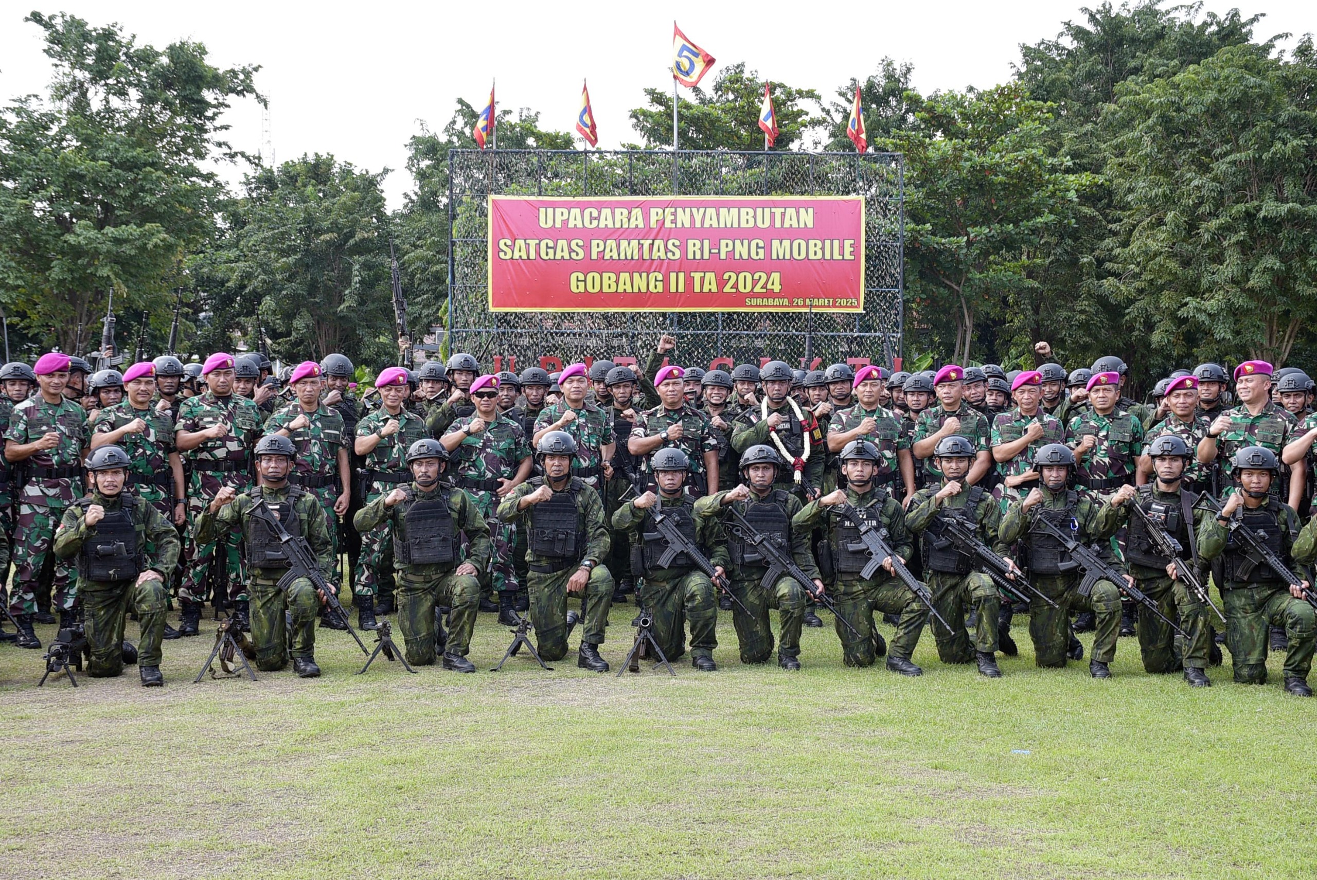 Dispen Kormar, TNI AL (Surabaya). Komandan Pasmar 2 Brigjen TNI (Mar) Nanang Saefulloh, S.E., M.M., menyambut kedatangan Prajurit Korps Marinir yang tergabung dalam Satgas Pamtas RI-PNG Mobile Korps Marinir Gobang II TA 2024 di Kesatrian Marinir Soeroto II, Ujung Semampir, Surabaya, Jawa Timur. Rabu (26/03/2025).
