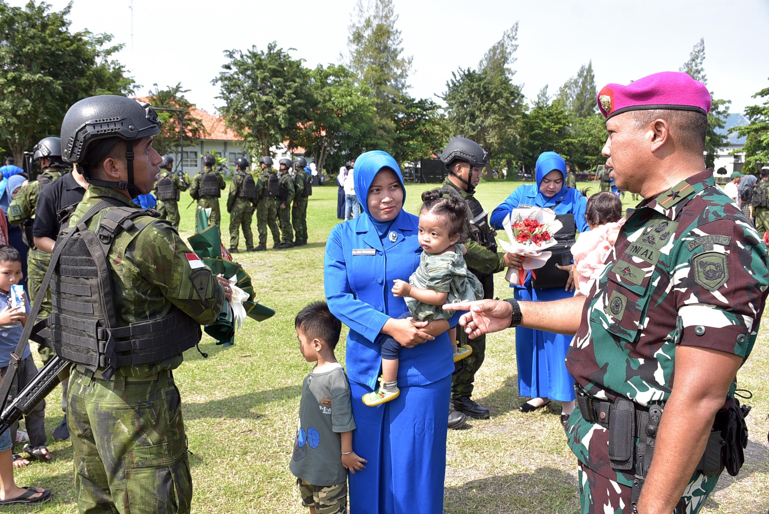 Prajurit Pasmar 2 yang tergabung dalam Satgas Pamtas RI-PNG Mobile Korps Marinir Gobang II di bawah pimpinan Mayor Marinir Tirta Ferdiansyah, kembali setelah melaksanakan tugas pengamanan perbatasan di Kabupaten Yahukimo Provinsi Papua Pegunungan.