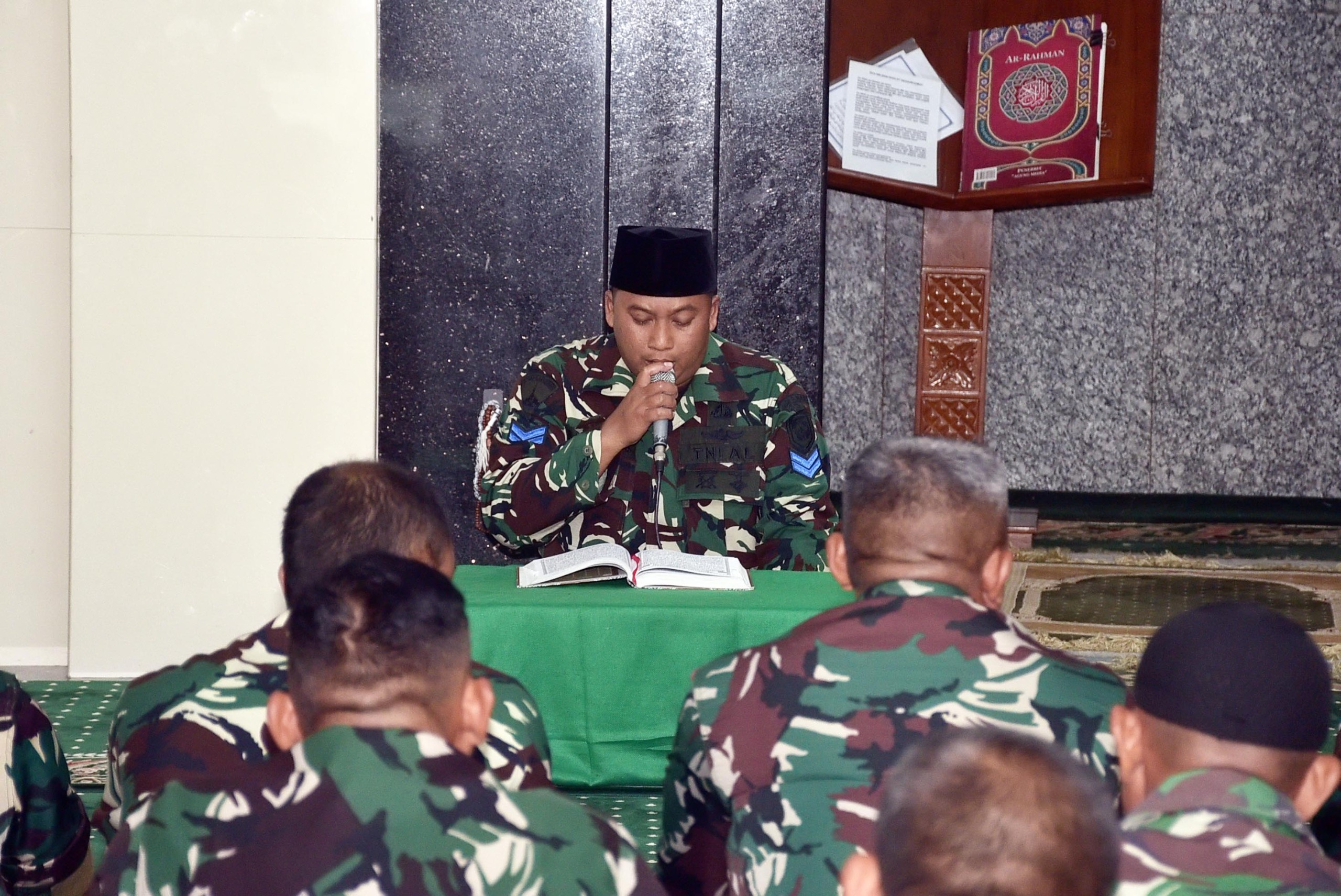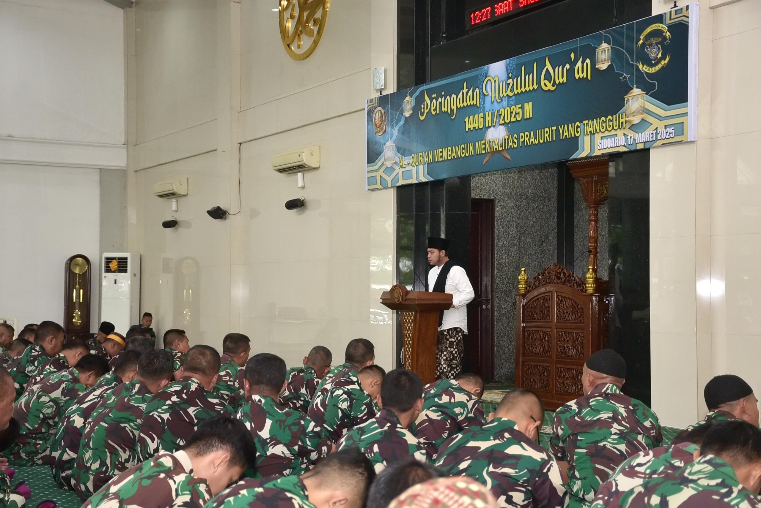 Dispen Kormar, TNI AL (Sidoarjo). Prajurit dan PNS Denmako Pasmar 2 memperingati Nuzulul Quran 1446 Hijriyah / 2025 Masehi, di Masjid Al Bahar Kesatrian Marinir Moekijat, Mako Pasmar 2, Gedangan, Sidoarjo. Senin (17/03/2025).