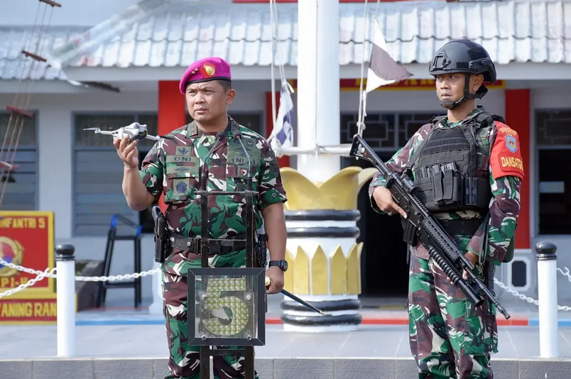 S.A.P., M.M., M.Tr.Opsla., menyerahkan drone surveillance kepada prajurit Yonif