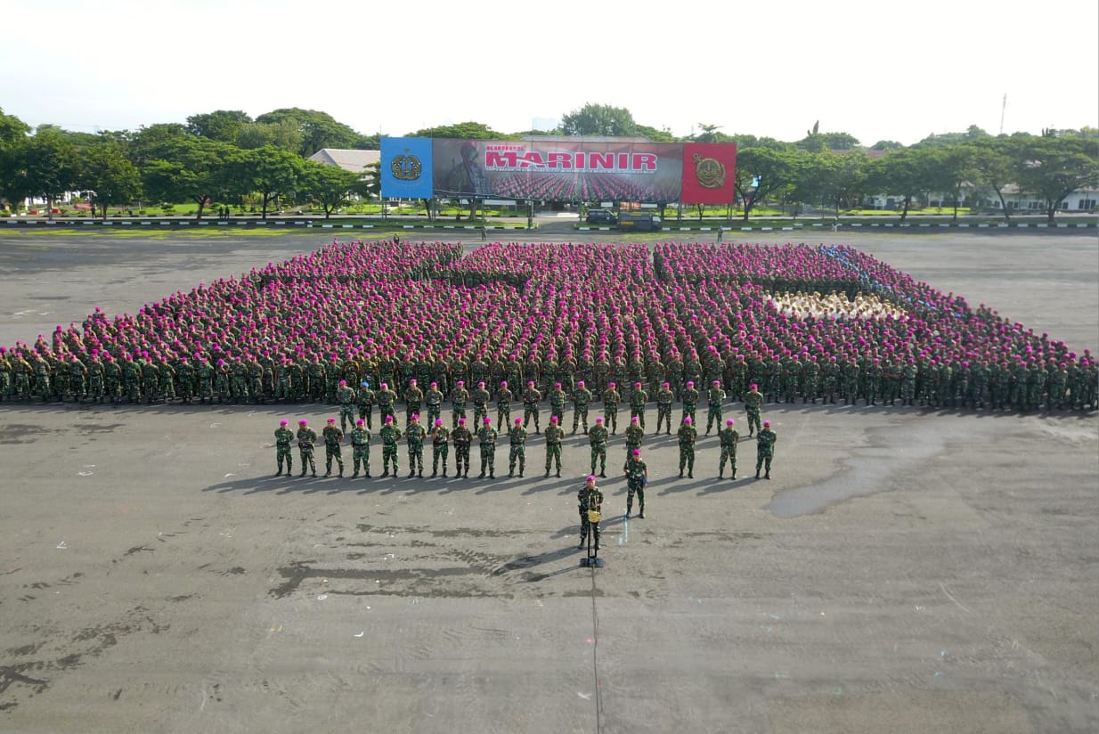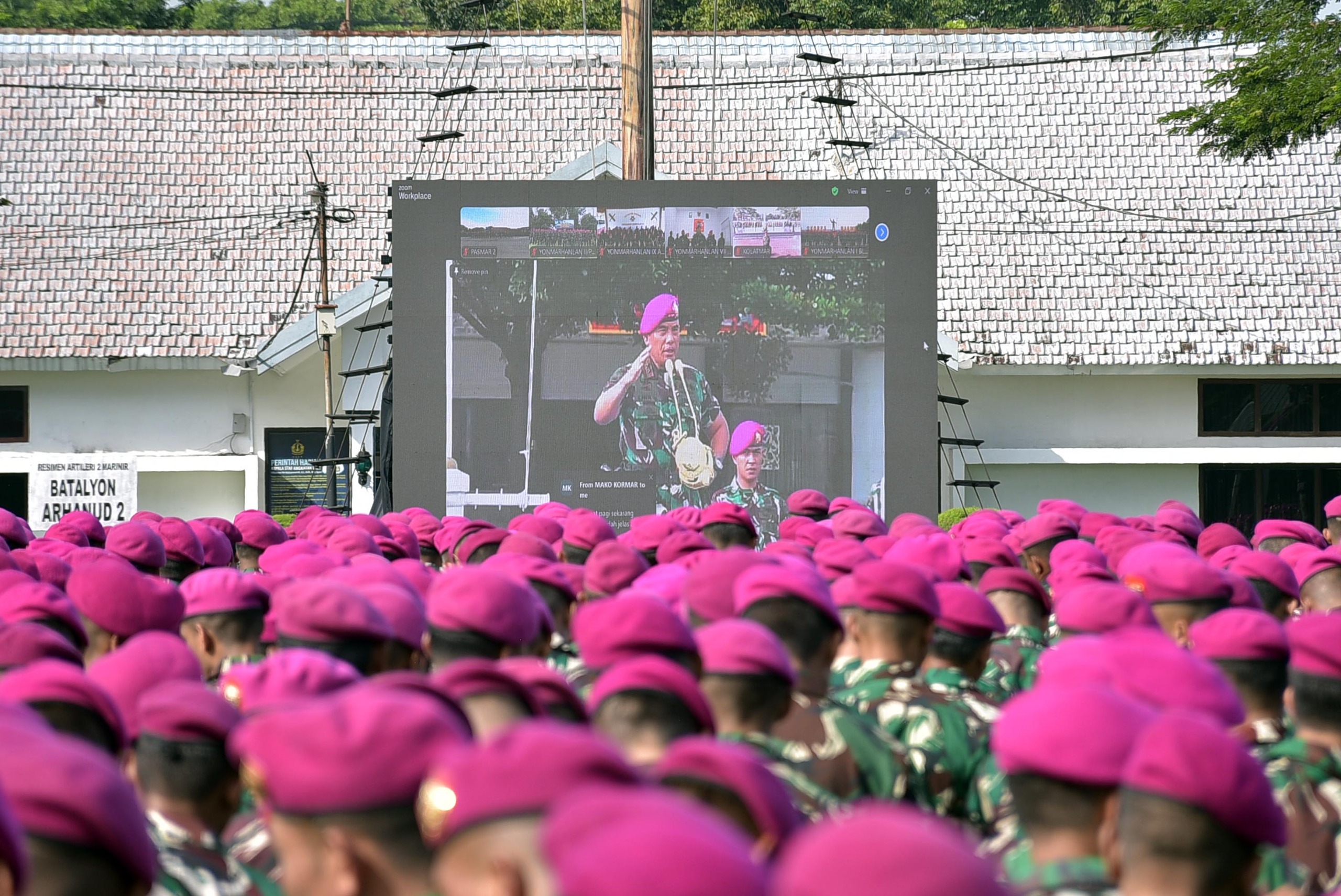 Dispen Kormar TNI AL (Surabaya). Ribuan Prajurit Pasmar 2 dipimpin oleh Komandan Pasmar 2 Brigjen TNI (Mar) Nanang Saefulloh, S.E., M.M., mengikuti apel khusus Dankormar secara vicon di lapangan apel Ksatrian Marinir Soetedi Senaputra Karangpilang Surabaya. Kamis (20/03/2025)